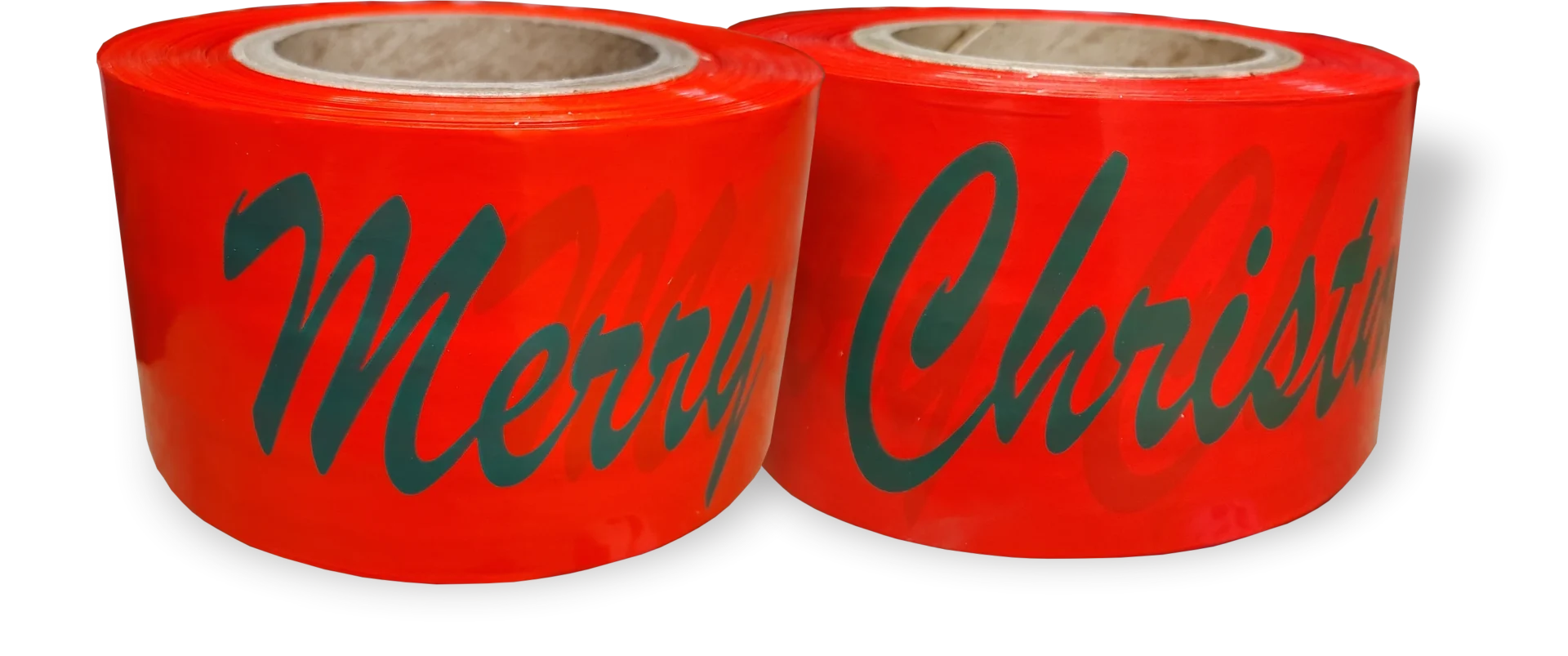 Red film with Dark green print that reads “Merry Christmas”. Rolls are 3 inches wide by 500 feet in length.